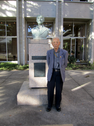 学院の創始者であるジェームス・カーティス・ヘボン博士の胸像前にて