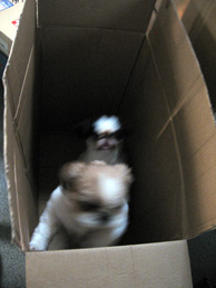 (左)梱包した荷物の山 (右)段ボール箱に入って遊ぶブースケとパンダ