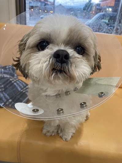 動物病院にて。エリザベスカラーを着け神妙な顔。