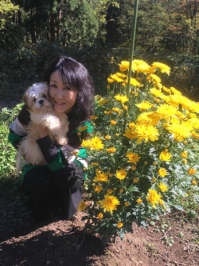 ブースケのお墓に咲いた菊を愛でるクースケとママリン |