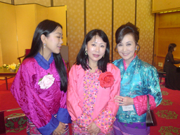 私も理事のひとりを務める日本ブータン芸術 委員会がブータンから文化使節を招き、日本 の伝統工芸などを学んで頂きました。この他 にも様々な形でブータンとの文化交流を推進 しました。写真は来日中のブータン王妃(中 央)、第一王女(左)、私(右) |