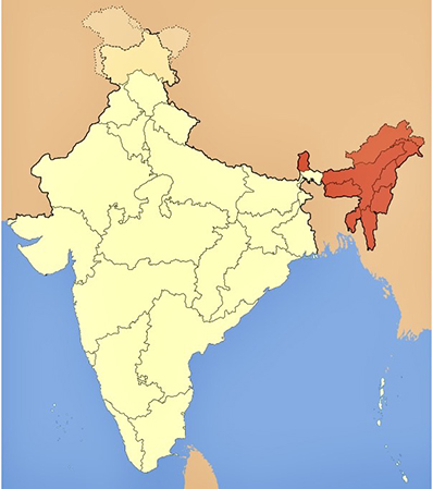 インドの地図。右上に濃い色で示した部分が北東部です。