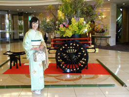と、以前、荒井宗羅先生から教わったことがありましたので、今日は迷わず光沢ある薄緑色の訪問着を選びました。写真ではわかりづらいのですが、金のアゲハ蝶(刺繍)がたくさん飛んでいるんですよ。
