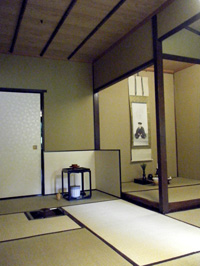 (右)席入りの予約券 (右)流祖・川上不白の肖像画が掛けられたお床