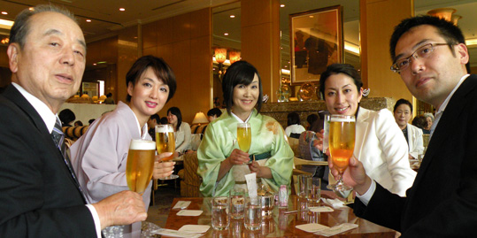 お茶のあとは、もちろんコレですよコレ(笑)。左から林さん、荒井先生、私、高田さん、唄さん |