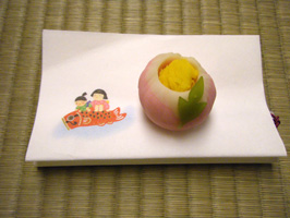 (左)こちらは第2席目で供された、牡丹をかたどったお菓子♪ 鯉のぼり柄の懐紙(自前)が可