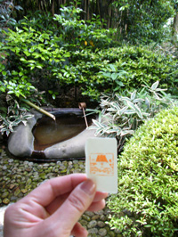 (左)蹲(つくばい)で手を浄めてから席入り (右)本日の席主、佃一可さんとのツーショット