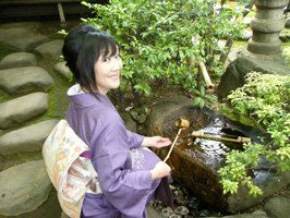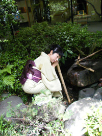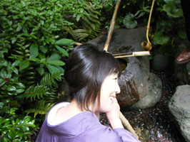 お庭には水琴窟もあります。水が奏でる神秘的な音に耳を傾ける藤波亜由子さん(左)と私