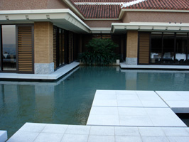 水をふんだんに使った設計は、かなりバリ島風。あるいは無人島にやって来たような錯覚に陥るかも