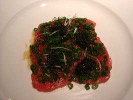 (左)近海マグロのカルパッチョ キャビア添え (右)野菜入りヘルシースープ