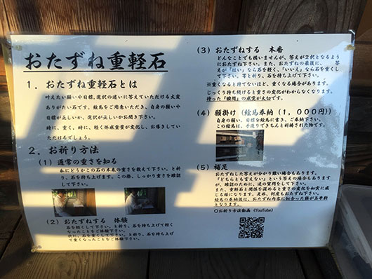 いわゆる「村の鎮守の神さま」的なローカルな神社なのですが、ここには願い事が叶う場合には軽く、叶わない場合には重くなるという、一種の占いができる重軽石(おもかるいし)というものが置かれています。