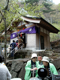 (左)横から見た滝 (右)上流の不動尊では甘酒がふるまわれていました