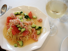 ここで何か食べなければ倒れそうだったので、よく出版社の人たちとの打ち合わせに使っているアトレ2Fの「ル・シャン・ド・ピエール」というお店に行き、蟹をたっぷり使った冷製パスタと、あろうことか昼間から白ワインをオーダー(笑)。