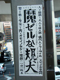 (左)渋谷駅近くで見かけたフシギかつブキミな貼り紙 (右)ビルの間に見える