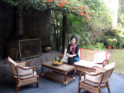 朝食は大きな暖炉(右の写真に写っています)で薪を炊いてもらい、お庭でいただきました
