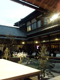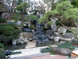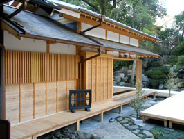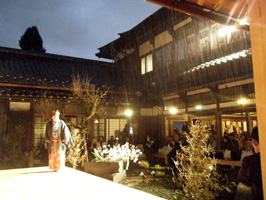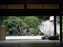新築された書院(左)と滝の流れる池。この前庭に舞台をしつらえ、能狂言を行なうという趣向です
