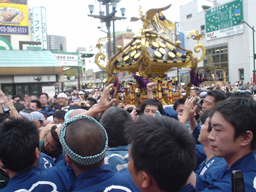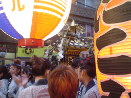 「そのへんの人、ここは危ないよ。御神輿に潰されないように!」などと言われても、今さらどうやったら動けるんだ〜って感じです。後から後からワッショイワッショイとやって来た御神輿に挟まれて、あっと言う間に身動き不可能な状態に……。 |