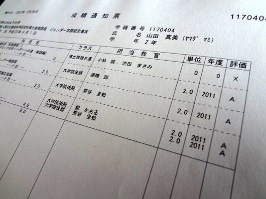 昨日、大学の教務課へ行って2011年度の成績通知表を受け取ってきました。