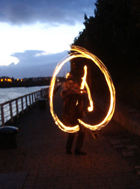 (右)パーティー会場のすぐ近くで、松明を振って参加者を歓迎してくれるパフォーマー |