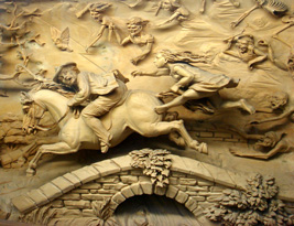 (左)魔女に追われるタム(彫刻)。スコットランドでは、絵画や彫刻などあらゆるアートの