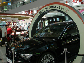 真夜中のドバイ空港。さりげなく置かれたBMWは、なんと「くじ」の景品ですって