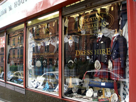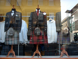 ペイズリーの街で。タ−タン柄のキルトスカートがさりげなく並んだ洋服店がとってもオシャレ。