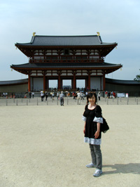 (左)朱雀門から見た大極殿 (右)復元された大極殿前にて、官二位三位の衣裳でコスプレ
