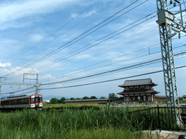 大極殿(左写真の建物)と朱雀門(右写真の建物)のあいだの広大な敷地を、ナント電車が