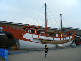 (左)原寸大に復元された遣唐使船。ここに約150人が乗せられました。内部の様子などの