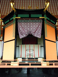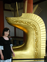 大極殿の中に展示された、実物大の“しゃちほこ”模型(左)と、