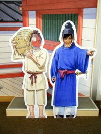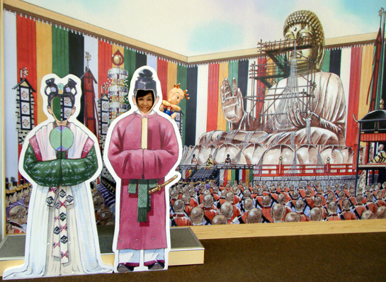 当時の貴族の様子をあらわした顔ハメ。後方の大仏開眼供養壁画と合わせるとかなりの力作です!
