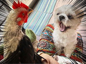 ![]() 他のオスと喧嘩をし、ケガの治療のためしばらく 人間の家で暮らしたニワトリさんが、晴れて退院。 お祝いの言葉を述べる(?)クースケ氏。 「週刊マミ自身」第654号 |