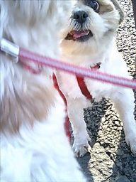 ![]() 「色違いのハーネスを買いました。サイズは 一緒ですが、ピアノのほうが若干キツめ? な~んてレディに失礼ですね(汗)。 「週刊マミ自身」第659号 |