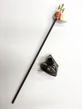 修復前(左)と修復後(右)の三叉戟と烏帽子。 |