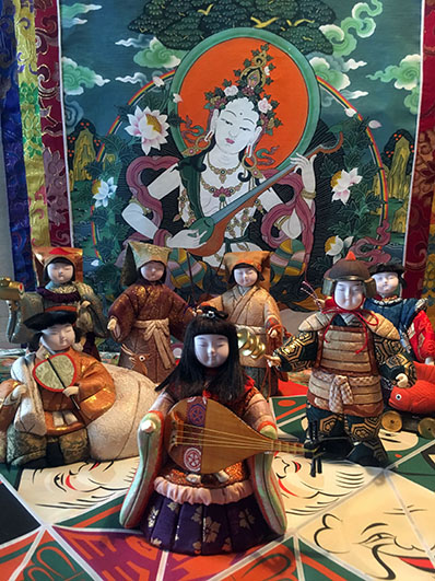 後方の弁才天掛け軸はインド人絵師に描いてもらったもの。 |