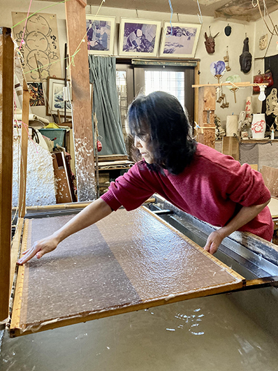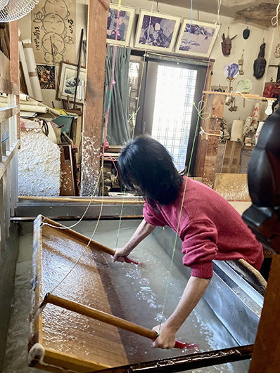 この日は地元のラジオ局が工房を取材に見えたため、いつもよりちょっぴり賑やかな雰囲気の中で、前回よりもかなり大きな紙を漉きましたよ。 |
