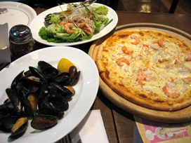 お料理のサイズは標準より大きめ。ムール貝が美味しかった♪ タブロイド風のメニューがオシャレです