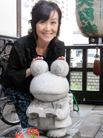 信州でのひとコマ (左)「カエル大明神」というお宮の前に立っていた二宮金治郎型カエル