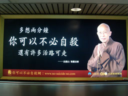 台北空港で見た自殺防止キャンペーンの広告。語りかけているのは台湾の有名なお坊さんだそうです |