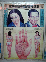 (右)占い師の家の外壁に貼られた、いかにも妖しいポスター