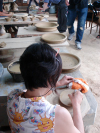 窯元の野口悦士さんに手取り足取り指導していただきながら、みんなで轆轤(ろくろ)を回して参りました。 |