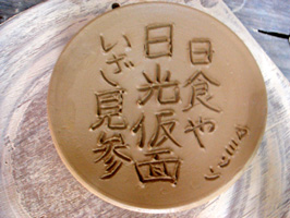 そこでサッサと陶芸は諦め(苦笑)、今度は野口さんが作ってくださったお皿のうえに日食がテーマの川柳を刻むことにしました。