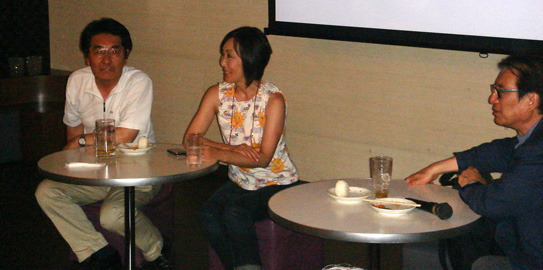 薄暗い中で鹿児島の芋焼酎「甘露」(美味!!!)を飲みながら、インドの日食神話をテーマにトーク中