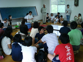 天気が悪いので公民館に場所を移し、種子島産の茶葉を使った科学の実験的お茶会をスタート