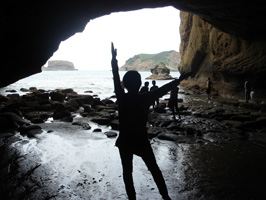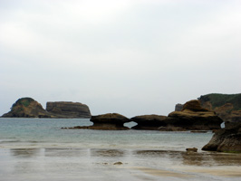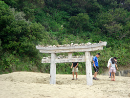 強風や海水の浸食によって不思議な形に削られた岩や、砂浜に深く埋もれてしまった鳥居がならぶ海岸を歩いたり、 |