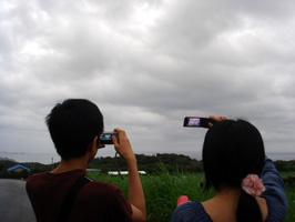 7月22日午前10時52分、皆既日食開始まであと6分。見えない太陽をバックに記念撮影 |