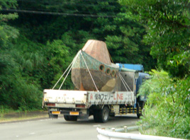 途中、マイクロバスの目の前を、どこかで見たことがあるような船を乗せたトラックが2台走って行きました。