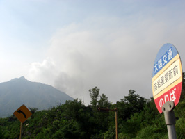 溶岩展望所前のバス停。もくもくと煙を吐いているのが桜島です |