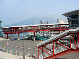 (左)桜島行きのフェリー乗り場 (右)鹿児島港から桜島をバックに記念撮影