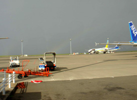 (左)空港内を移動するバスから見たダブルレインボー(もうほとんど見えないけれど……)